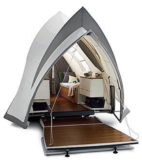 以下我們展示一些帳篷。這些可充氣帳篷的前身是棱角分明的楔形帳篷。如今,楔形帳篷被升級改造成流線造型帳篷,在大風(fēng)吹襲下,這類帳篷的穩(wěn)定性比較高。