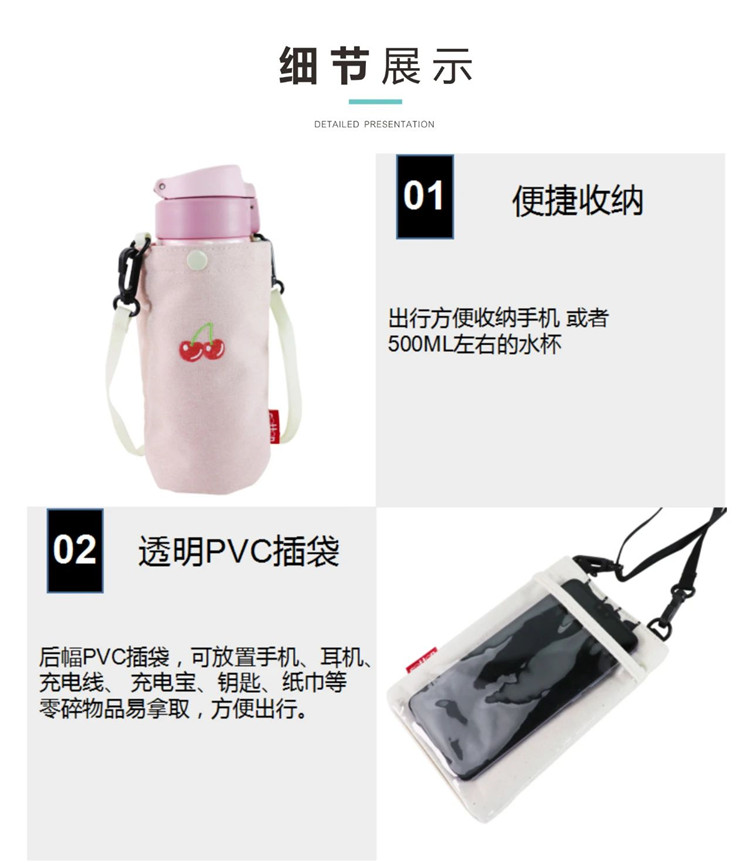 小巧精致的水杯手機包可裝水杯,手機,小物件內里增加可耐高溫里布后幅pvc材質,手機不用取出,可劃屏使用