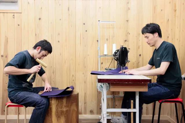 捶打會由比較資淺的工匠在一個圓木樁上進行。敲出折角后,再交給資深的前輩進行縫紉。據說,他們家工匠隨著制作帆布袋技術的提升,從圓木樁走到縫紉機這個面對面的距離,所需要的時間是 7-8 年。
