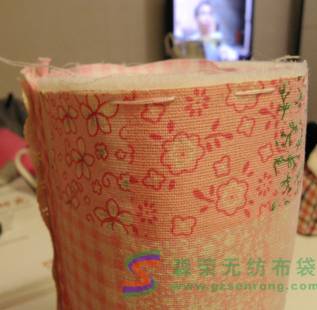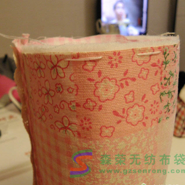 第二步,收緊兩頭做出圓筒狀。這一步看起來難,其實非常簡單。針穿透全部的表里布以及鋪棉,采用平針疏縫,但是間距要大,(如果間距太小拉緊的時候會比較吃力),而且間距注意要均勻(包型對稱漂亮就靠它了),如果不成功可以多試幾次。