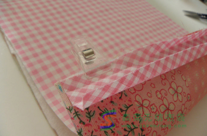 這款化妝包最大的優點在于包型簡單,表布,里布和鋪棉只需要裁成矩形或者正方形即可。至于長寬的尺寸,建議大概在20cm左右即可。將表布,鋪棉和里布對好,在裁的時候注意表布由于要包過來,而且考慮到鋪棉的厚度,可以比里布的長度略長,但也不是必須。鋪棉如果是帶膠的,就直接熨好使三層粘合好。不是帶膠的也沒關系。